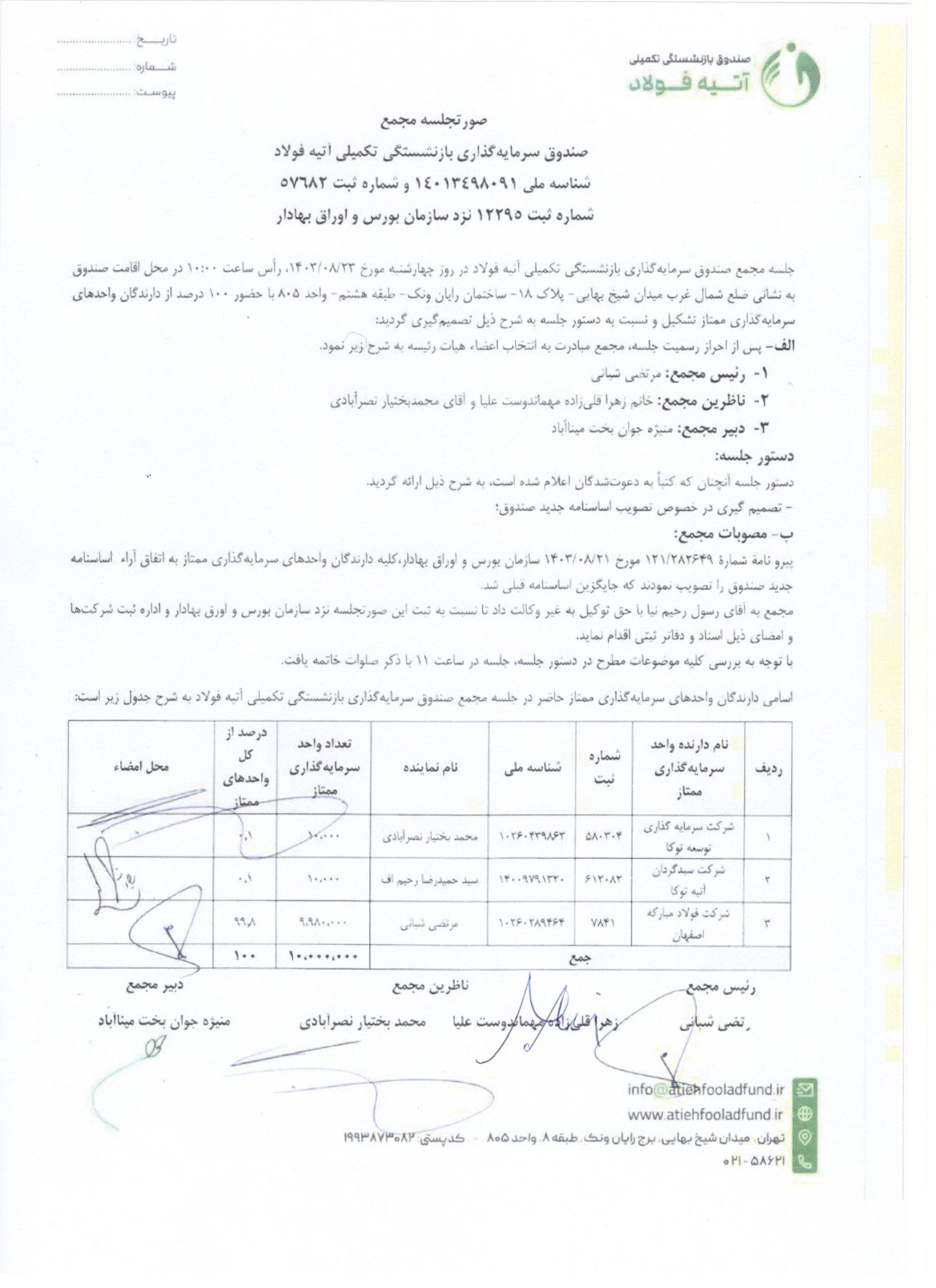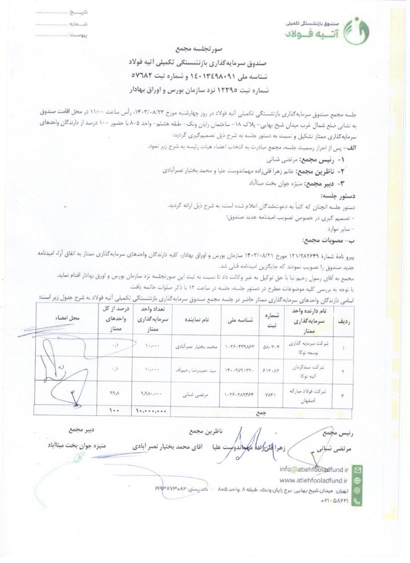 صورتجلسه مجمع اساسنامه ای صندوق سرمایه گذاری بازنشستگی تکمیلی آتیه فولاد- مورخ ۱۴۰۴/۰۲/۲۹ ساعت ۱۲